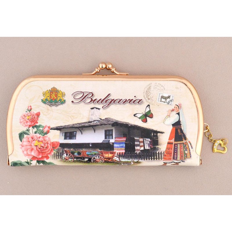 Сувенирно малко портмоне от изкуствена кожа с изобразена - старинна къща и надпис България. Портмонето е със закопчалка. Размери - 20х10 см.